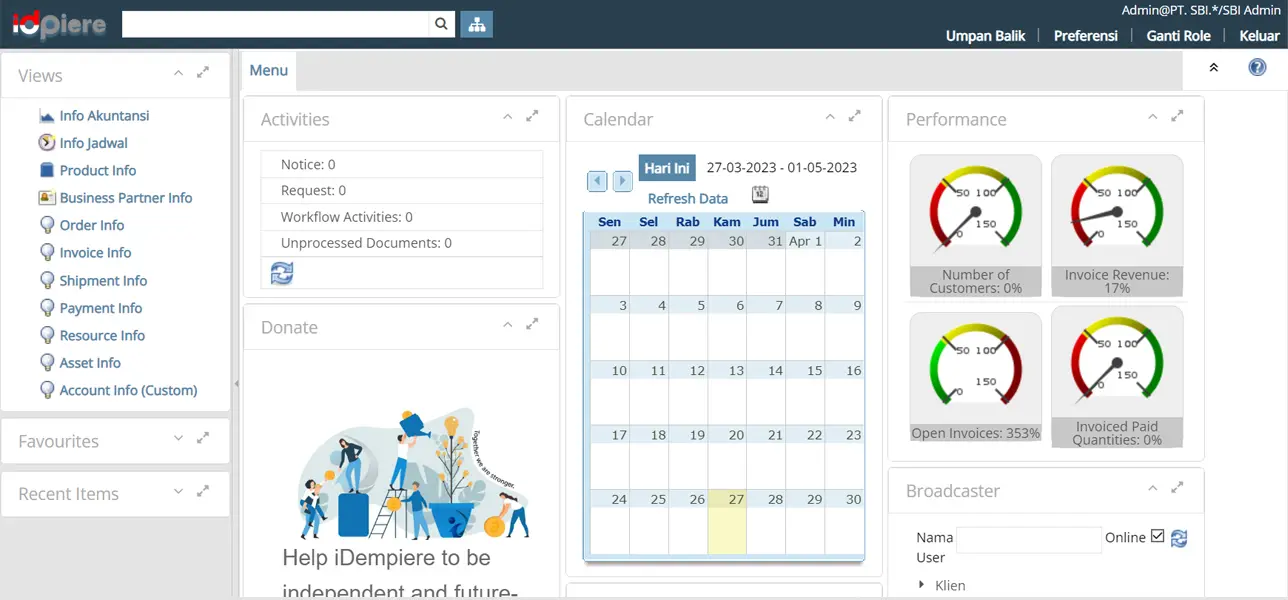 Implementasi sistem iDempiere ERP pada PT. SBI, sebuah perusahaan yang bergerak di bidang jasa konsultan, dilakukan pada periode Agustus hingga September 2020. Proyek ini dirancang untuk menjawab kebutuhan manajemen operasional perusahaan dengan jumlah pengguna aktif di bawah 20 orang. Lingkup implementasi disesuaikan dengan karakteristik bisnis jasa, sehingga fokus utamanya adalah pada efisiensi proses dan integrasi antar departemen dalam satu sistem terpadu.